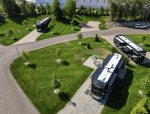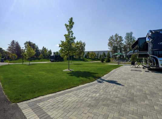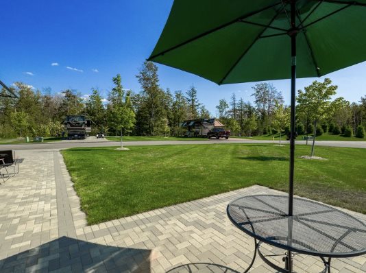 This back-in lot features brick-paved parking areas with 75 foot RV pad handsome boarder and a large patio living space facing east affording beautiful Northern Michigan sunrises and afternoon shade. The living space features Bistro-style tables and chairs. These are simple yet very stylish. This lot features the latest WIFI capabilities, perfect for working, studying, or planning your next adventure from the comforts of the motorcoach or patio area.